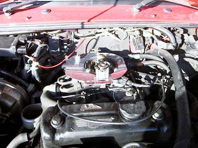 写真で示しているねじ3本を取り外しエアクリーナを取り外します。 このとき、スロットルボディと接続されているホースを抜き、吸気温度センサもコネクタ部で外します。